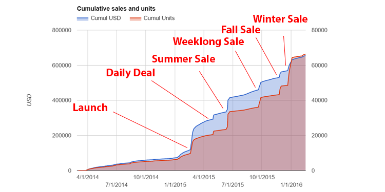 As you can see from this chart below, I’d get a nice influx of new players during a sale but they’d drop off soon after. Also, lots of people who picked it up during a sale wouldn't play it immediately - I might see a 20x increase in units sold during sale but only a 5x growth in active players for that period.