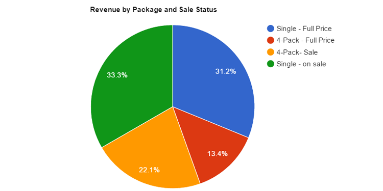 One other interesting effect is 4-packs accounted for ~ 35% of total revenue. During a sale, 4-packs sold particularly well. It’s impossible to know for sure if total revenue would have been higher without the 4-pack option available, but my hunch is that the high price of the 4-pack provided an anchor that made sale units more attractive and probably encouraged many players to upgrade to a 4-pack instead of a single copy (benefitting both revenue and player counts).
