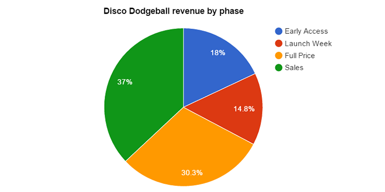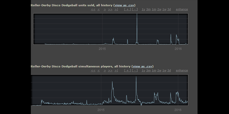 - Sale Features. This was another lucky break that I had very little direct control over. The game received a flash sale during the 2015 Summer sale, resulting in its best single day of revenue. It also got a non-flash feature during the smaller Fall sale. My best guess is that Valve’s algorithm surfaced Disco Dodgeball as a feature candidate for the same reason it was getting good discovery / recommendation traffic. While the game did sell surprisingly well during a self-run weekly sale (thanks again due to recommendation traffic) these main feature spots during huge front-page traffic periods are undeniably valuable.
